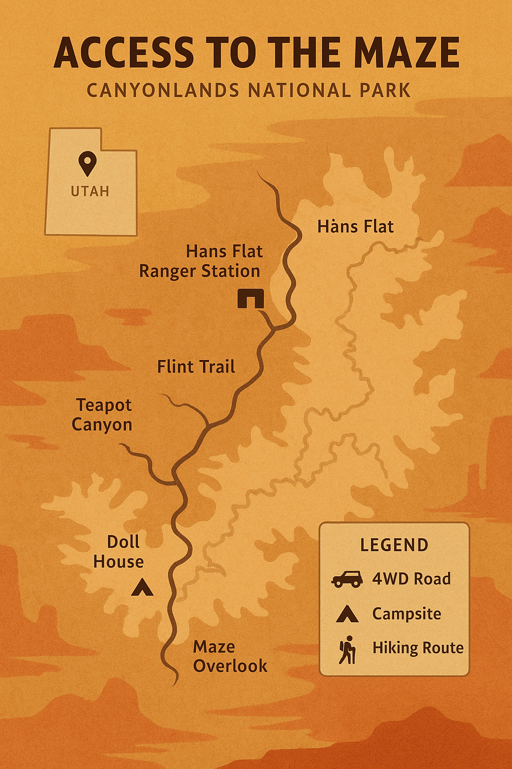 Travel Time | From Green River to Hans Flat: ~2.5 hours; Hans Flat to Maze Overlook: ~3–4 hours 4WD |